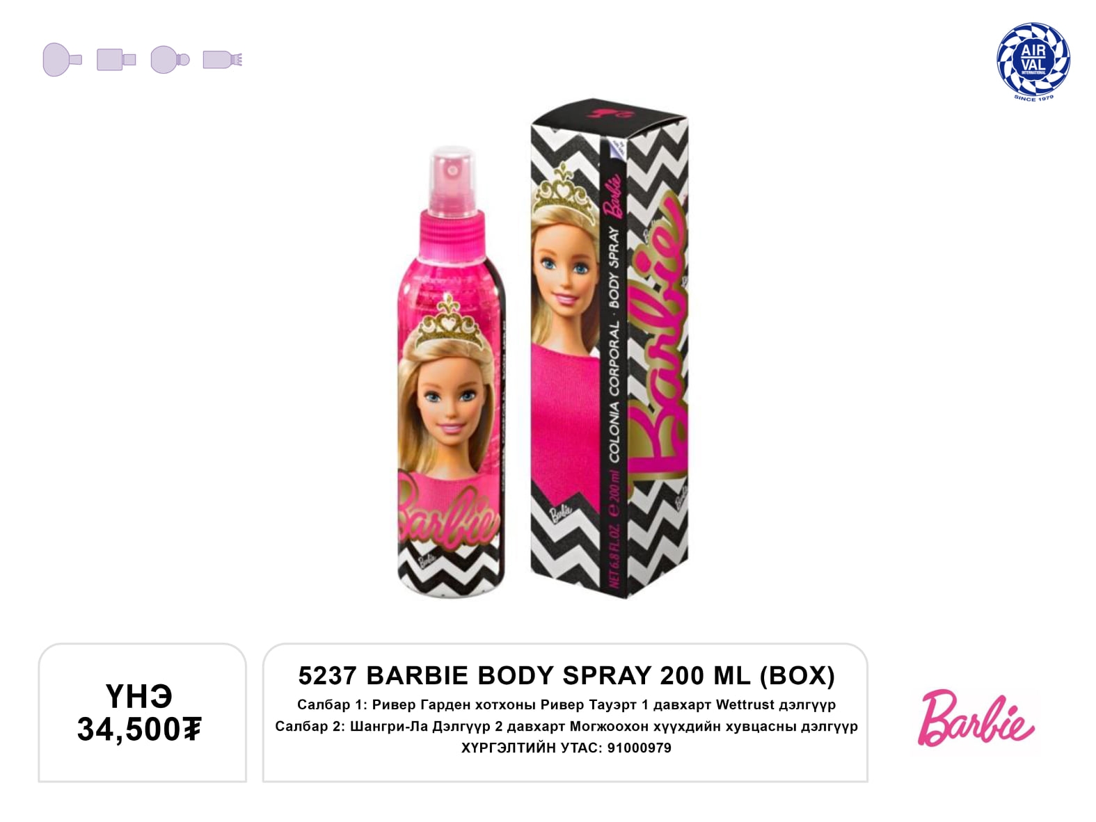 [body] => Air-Val брэндийн албан ёсны “Barbie” цувралын энэхүү биеийн спрей нь охидод зориулсан анхилуун, хөгжилтэй үнэртэй бүтээгдэхүүн юм. Цайвар ягаан өнгийн гялалзсан савлагаа, Barbie дүрээрээ ялгардаг ба охидын өдөр тутмын хэрэглээнд тохиромжтой, зөөлөн анхилуун үнэртэй.